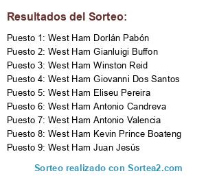 Lista de participantes: West Ham Felipe Melo, West Ham Danny, West Ham Taison Barcellos Freda, West Ham Antonio Valencia, West Ham Kwadwo Asamoah, West Ham Dorlán Pabón, West Ham Antonio Candreva, West Ham Paulinho, West Ham Giovanni Dos Santos, West Ham Ricardo Quaresma, West Ham Eliseu Pereira, West Ham Kevin Prince Boateng, West Ham Gianluigi Buffon, West Ham Juan Jesús, West Ham Alphonse Areola, West Ham Seydou Doumbia, West Ham Winston Reid, West Ham Nabil Fekir, West Ham Ximo Navarro.
