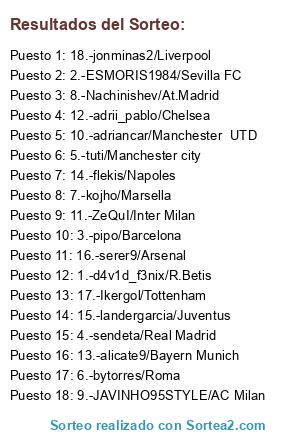 Lista de participantes: 1.-d4v1d_f3nix/R.Betis, 2.-ESMORIS1984/Sevilla FC, 3.-pipo/Barcelona, 4.-sendeta/Real Madrid, 5.-tuti/Manchester city, 6.-bytorres/Roma, 7.-kojho/Marsella, 8.-Nachinishev/At.Madrid, 9.-JAVINHO95STYLE/AC Milan, 10.-adriancar/Manchester UTD, 11.-ZeQuI/Inter Milan, 12.-adrii_pablo/Chelsea, 13.-alicate9/Bayern Munich, 14.-flekis/Napoles, 15.-landergarcia/Juventus, 16.-serer9/Arsenal, 17.-Ikergol/Tottenham, 18.-jonminas2/Liverpool.