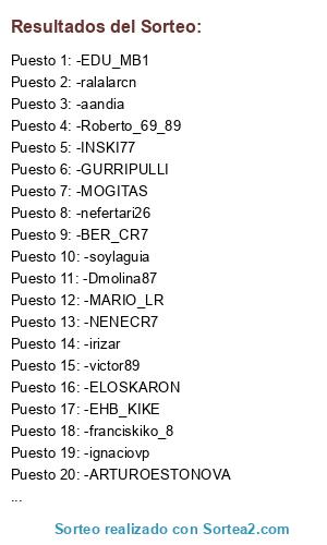 Lista de participantes: -lagmor80, -INSKI77, -linares35, -EDU_MB1, -irizar, -ralalarcn, -ignaciovp, -Enosthar, -aandia, -NENECR7, -nefertari26, -EHB_KIKE, -RECOBA20, -soylaguia, -ELMUMO, -ELOSKARON, -GURRIPULLI, -MOGITAS, -ZER11, -ARTUROESTONOVA, -reywwf619, -franciskiko_8, -BER_CR7, -GOKUH27, -Roberto_69_89, -Achachancha2, -calcetines, -Dmolina87, -victor89, -MARIO_LR.