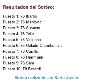 Lista de participantes: 78 Markovic, 78 Berardi, 78 Ibarbo, 78 Carrillo, 78 Tello, 78 Oxlade-Chamberlain, 78 Herrmann, 78 Susaeta, 78 Sam, 78 Vieirinha.