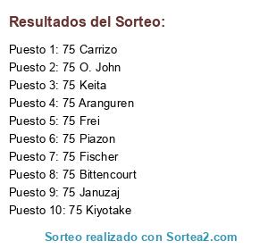 Lista de participantes: 75 Carrizo, 75 Keita, 75 Kiyotake, 75 Aranguren, 75 Januzaj, 75 Frei, 75 Fischer, 75 Bittencourt, 75 Piazon, 75 O. John.