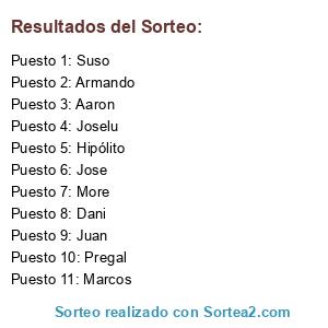 Lista de participantes: Juan, Suso, Joselu, Dani, Pregal, Armando, Hipólito, More, Jose, Marcos, Aaron.