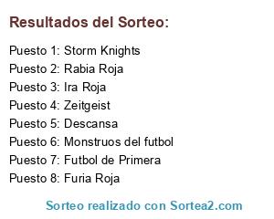 Lista de participantes: Furia Roja, Storm Knights, Ira Roja, Zeitgeist, Monstruos del futbol, Rabia Roja, Futbol de Primera, Descansa.