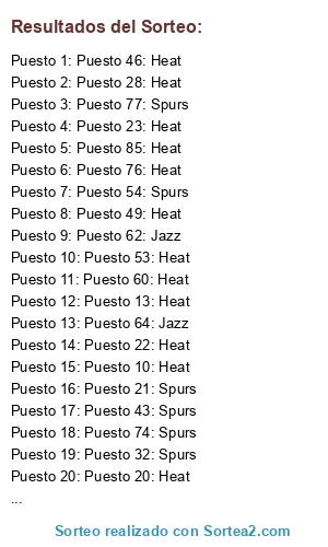 Lista de participantes: Puesto 1: Jazz, Puesto 2: Heat, Puesto 3: Spurs, Puesto 4: Spurs, Puesto 5: Spurs, Puesto 6: Jazz, Puesto 7: Jazz, Puesto 8: Spurs, Puesto 9: Spurs, Puesto 10: Heat, Puesto 11: Heat, Puesto 12: Jazz, Puesto 13: Heat, Puesto 14: Jazz, Puesto 15: Heat, Puesto 16: Heat, Puesto 17: Spurs, Puesto 18: Heat, Puesto 19: Jazz, Puesto 20: Heat, Puesto 21: Spurs, Puesto 22: Heat, Puesto 23: Heat, Puesto 24: Spurs, Puesto 25: Spurs, Puesto 26: Spurs, Puesto 27: Jazz, Puesto 28: Heat, Puesto 29: Jazz, Puesto 30: Spurs, Puesto 31: Spurs, Puesto 32: Spurs, Puesto 33: Jazz, Puesto 34: Spurs, Puesto 35: Jazz, Puesto 36: Spurs, Puesto 37: Spurs, Puesto 38: Heat, Puesto 39: Heat, Puesto 40: Heat, Puesto 41: Spurs, Puesto 42: Jazz, Puesto 43: Spurs, Puesto 44: Heat, Puesto 45: Jazz, Puesto 46: Heat, Puesto 47: Heat, Puesto 48: Heat, Puesto 49: Heat, Puesto 50: Heat, Puesto 51: Jazz, Puesto 52: Heat, Puesto 53: Heat, Puesto 54: Spurs, Puesto 55: Heat, Puesto 56: Heat, Puesto 57: Heat, Puesto 58: Jazz, Puesto 59: Heat, Puesto 60: Heat, Puesto 61: Jazz, Puesto 62: Jazz, Puesto 63: Jazz, Puesto 64: Jazz, Puesto 65: Spurs, Puesto 66: Heat, Puesto 67: Jazz, Puesto 68: Heat, Puesto 69: Jazz, Puesto 70: Spurs, Puesto 71: Spurs, Puesto 72: Spurs, Puesto 73: Spurs, Puesto 74: Spurs, Puesto 75: Spurs, Puesto 76: Heat, Puesto 77: Spurs, Puesto 78: Heat, Puesto 79: Spurs, Puesto 80: Heat, Puesto 81: Spurs, Puesto 82: Jazz, Puesto 83: Heat, Puesto 84: Spurs, Puesto 85: Heat.