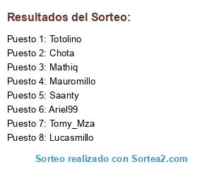 Lista de participantes: Mauromillo, Mathiq, Lucasmillo, Ariel99, Totolino, Chota, Saanty, Tomy_Mza.