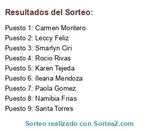 Lista de participantes: Rocio Rivas , Smarlyn Ciri , Ileana Mendoza , Namibia Frias , Carmen Montero , Paola Gomez , Santa Torres , Leccy Feliz , Karen Tejeda.