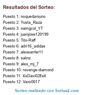 Lista de participantes: alexsanfer11, adri16_adidas, alex_mj_7, juanjose120199, noquedaniuno, revenge-diamond, salinz, swingcol_YT, Tito-Raff, Varo0017, XxDavi028xX, Yusta_Raza.