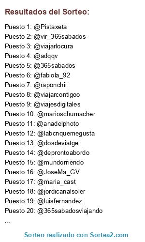 Lista de participantes: @Pistaxeta (2 participaciones), @vir_365sabados (2 participaciones), @viajesdigitales (2 participaciones), @fabiola_92 (2 participaciones), @labcnquemegusta (2 participaciones), @deprontoabordo (2 participaciones), @iciarbcn (2 participaciones), @petitsviatgers (3 participaciones), @raponchii (2 participaciones), @PlanetaDunia (2 participaciones), @dosdeviatge (2 participaciones), @davidsanfer (2 participaciones), @maria_cast (2 participaciones), @viajesalalcance (2 participaciones), @365sabados (2 participaciones), @marioschumacher (3 participaciones), @jordicanalsoler (2 participaciones), @lidiabarbaridad, @JoseMa_GV (3 participaciones), @ViatgesP (2 participaciones), @luisfernandez (2 participaciones), @Sara_Terrones (2 participaciones), @instintoviajes (2 participaciones), @mundorriendo (2 participaciones), @viajarcontigoo (2 participaciones), @cerezoalejandro (2 participaciones), @viajarlocura(2 participaciones), @enodius_es (2 participaciones), @IreviIrene (2 participaciones), 2) Instagram, @rehtse01 , @elmundodepedrooo , @prabathmandi , @dondevamoseva , @evasoldino , @travellinggerman , @trip2happiness , @viajarlocuratodo , @maria_cast84 , @anadelphoto , @adqqv , @365sabadosviajando , @misspiesviajeros.