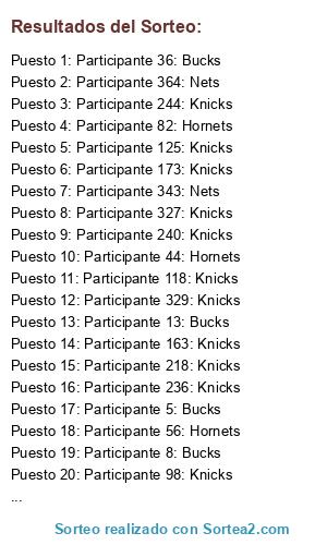 Lista de participantes: Participante 1: Bucks, Participante 2: Bucks, Participante 3: Bucks, Participante 4: Bucks, Participante 5: Bucks, Participante 6: Bucks, Participante 7: Bucks, Participante 8: Bucks, Participante 9: Bucks, Participante 10: Bucks, Participante 11: Bucks, Participante 12: Bucks, Participante 13: Bucks, Participante 14: Bucks, Participante 15: Bucks, Participante 16: Bucks, Participante 17: Bucks, Participante 18: Bucks, Participante 19: Bucks, Participante 20: Bucks, Participante 21: Bucks, Participante 22: Bucks, Participante 23: Bucks, Participante 24: Bucks, Participante 25: Bucks, Participante 26: Bucks, Participante 27: Bucks, Participante 28: Bucks, Participante 29: Bucks, Participante 30: Bucks, Participante 31: Bucks, Participante 32: Bucks, Participante 33: Bucks, Participante 34: Bucks, Participante 35: Bucks, Participante 36: Bucks, Participante 37: Bucks, Participante 38: Bucks, Participante 39: Bucks, Participante 40: Hornets, Participante 41: Hornets, Participante 42: Hornets, Participante 43: Hornets, Participante 44: Hornets, Participante 45: Hornets, Participante 46: Hornets, Participante 47: Hornets, Participante 48: Hornets, Participante 49: Hornets, Participante 50: Hornets, Participante 51: Hornets, Participante 52: Hornets, Participante 53: Hornets, Participante 54: Hornets, Participante 55: Hornets, Participante 56: Hornets, Participante 57: Hornets, Participante 58: Hornets, Participante 59: Hornets, Participante 60: Hornets, Participante 61: Hornets, Participante 62: Hornets, Participante 63: Hornets, Participante 64: Hornets, Participante 65: Hornets, Participante 66: Hornets, Participante 67: Hornets, Participante 68: Hornets, Participante 69: Hornets, Participante 70: Hornets, Participante 71: Hornets, Participante 72: Hornets, Participante 73: Hornets, Participante 74: Hornets, Participante 75: Hornets, Participante 76: Hornets, Participante 77: Hornets, Participante 78: Hornets, Participante 79: Hornets, Participante 80: Hornets, Participante 81: Hornets, Participante 82: Hornets, Participante 83: Knicks, Participante 84: Knicks, Participante 85: Knicks, Participante 86: Knicks, Participante 87: Knicks, Participante 88: Knicks, Participante 89: Knicks, Participante 90: Knicks, Participante 91: Knicks, Participante 92: Knicks, Participante 93: Knicks, Participante 94: Knicks, Participante 95: Knicks, Participante 96: Knicks, Participante 97: Knicks, Participante 98: Knicks, Participante 99: Knicks, Participante 100: Knicks, Participante 101: Knicks, Participante 102: Knicks, Participante 103: Knicks, Participante 104: Knicks, Participante 105: Knicks, Participante 106: Knicks, Participante 107: Knicks, Participante 108: Knicks, Participante 109: Knicks, Participante 110: Knicks, Participante 111: Knicks, Participante 112: Knicks, Participante 113: Knicks, Participante 114: Knicks, Participante 115: Knicks, Participante 116: Knicks, Participante 117: Knicks, Participante 118: Knicks, Participante 119: Knicks, Participante 120: Knicks, Participante 121: Knicks, Participante 122: Knicks, Participante 123: Knicks, Participante 124: Knicks, Participante 125: Knicks, Participante 126: Knicks, Participante 127: Knicks, Participante 128: Knicks, Participante 129: Knicks, Participante 130: Knicks, Participante 131: Knicks, Participante 132: Knicks, Participante 133: Knicks, Participante 134: Knicks, Participante 135: Knicks, Participante 136: Knicks, Participante 137: Knicks, Participante 138: Knicks, Participante 139: Knicks, Participante 140: Knicks, Participante 141: Knicks, Participante 142: Knicks, Participante 143: Knicks, Participante 144: Knicks, Participante 145: Knicks, Participante 146: Knicks, Participante 147: Knicks, Participante 148: Knicks, Participante 149: Knicks, Participante 150: Knicks, Participante 151: Knicks, Participante 152: Knicks, Participante 153: Knicks, Participante 154: Knicks, Participante 155: Knicks, Participante 156: Knicks, Participante 157: Knicks, Participante 158: Knicks, Participante 159: Knicks, Participante 160: Knicks, Participante 161: Knicks, Participante 162: Knicks, Participante 163: Knicks, Participante 164: Knicks, Participante 165: Knicks, Participante 166: Knicks, Participante 167: Knicks, Participante 168: Knicks, Participante 169: Knicks, Participante 170: Knicks, Participante 171: Knicks, Participante 172: Knicks, Participante 173: Knicks, Participante 174: Knicks, Participante 175: Knicks, Participante 176: Knicks, Participante 177: Knicks, Participante 178: Knicks, Participante 179: Knicks, Participante 180: Knicks, Participante 181: Knicks, Participante 182: Knicks, Participante 183: Knicks, Participante 184: Knicks, Participante 185: Knicks, Participante 186: Knicks, Participante 187: Knicks, Participante 188: Knicks, Participante 189: Knicks, Participante 190: Knicks, Participante 191: Knicks, Participante 192: Knicks, Participante 193: Knicks, Participante 194: Knicks, Participante 195: Knicks, Participante 196: Knicks, Participante 197: Knicks, Participante 198: Knicks, Participante 199: Knicks, Participante 200: Knicks, Participante 201: Knicks, Participante 202: Knicks, Participante 203: Knicks, Participante 204: Knicks, Participante 205: Knicks, Participante 206: Knicks, Participante 207: Knicks, Participante 208: Knicks, Participante 209: Knicks, Participante 210: Knicks, Participante 211: Knicks, Participante 212: Knicks, Participante 213: Knicks, Participante 214: Knicks, Participante 215: Knicks, Participante 216: Knicks, Participante 217: Knicks, Participante 218: Knicks, Participante 219: Knicks, Participante 220: Knicks, Participante 221: Knicks, Participante 222: Knicks, Participante 223: Knicks, Participante 224: Knicks, Participante 225: Knicks, Participante 226: Knicks, Participante 227: Knicks, Participante 228: Knicks, Participante 229: Knicks, Participante 230: Knicks, Participante 231: Knicks, Participante 232: Knicks, Participante 233: Knicks, Participante 234: Knic