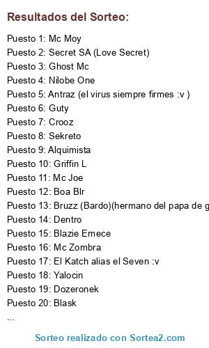 Lista de participantes: Agresk, Mc Moy, El Katch alias el Seven :v, Crooz, Kletal, GTwo, El Pelon De La Santa, Guty, Blazie Emece, Mc Zombra, Antraz (el virus siempre firmes :v ), Boc Bisor, Nityk Nhay, Posner (Muse), OztheOne, IceBerg, Arkantos FC, Hosh Nover, Keoz Dca, Skrip, Secret SA (Love Secret), Nilobe One, Sncia SC, J Criiz, Dreyser Doble E, Silver (Prince), Tesar One (Demico), Sekreto, Mc Poner, Zescko, Figuer One, Mc Track, Guatvic, Mc Joe, Bruzz (Bardo)(hermano del papa de goku), Alcoholigenio (Pain), Griffin L, Alquimista, Dentro, Blask, Big D, Yalocin, Master Draggo, Dererck One (poeta Callejero), Ache, Dekoy Mc, Ghost Mc, Mc Sckyrla Hyguer, Dozeronek, Boa Blr, Tenaz.