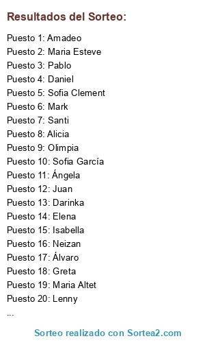 Lista de participantes: Lenny, Neizan, Olimpia, Chin chin, Ángela, Amadeo, Julia, Santi, Daniel, Mark, Darinka, Álvaro, Elena, Sofia Clement, Maria Esteve, Juan, Asier, Martina, Isabella, Greta, Sofia García, Maria Altet, Alicia, Pablo.