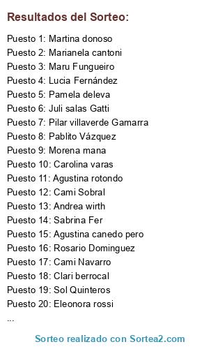 Lista de participantes: Macarena diez, Astrid christensen, Agus Asencio, Ceci silvestre, Cuki dokampo, Eleonora rossi, Pilar villaverde Gamarra, Jesica Saucedo, Maru Fungueiro, Pamela deleva, Gabriela frino, Cami Enei, Caro arean bortolot, Lucia Fernández, Cami Sobral, Juli salas Gatti, Sabrina Fer, Lorena almiron, Ber villamagna Flores, Ma mache, Andrea wirth, Merii Navarro, Patricia cacavella, Soff Navarro, Florencia campo, Marianela cantoni, Agus langone, Carolina varas, María Sepe arietti, Morena mana, Flor Rodríguez pruyas, Brenda López, Cami Navarro, Luciana Benegas, Agustina canedo pero, Sol Quinteros, Maca tedesco, Verá gesell, Agustina rotondo, Martina donoso, Clari berrocal, Valentina zavataro, Pablito Vázquez, Belu carcagno, Milagros Rilova, Fiorella Chicote, Mila rf, Rosario Dominguez, Camila Otero, Sofi muro, María c. Manuelli, Nicanor González tornquist, Constanza gestal, Euge Baccini, Mica puga, Charlott aufenacker, Agus Enei.