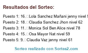 Lista de participantes: 1. Silvia de Marco jenny nivel 40, 2. Montchiponchi Po alice nivel 70 :), 3. Luisa Pérez Nat nivel 76, 4. Mónica Jiménez Durán Jenny nivel 56 :), 5. Jose Luis Pereira nat nivel 69, 6. Tamara Vallejos nat nivel 53, 7. Lola Cerrudo Tellez Alice nivel 48, 8. Rucas Castro Jim nivel 66 :*, 9. Claudia Vaz jenny nivel 61, 10. Dennis Murcia Jr. Fue Nat... nivel 49, 11. Monica Sol Ben Alice nivel 78, 12. Gema Fernández Belmonte jeny. 58, 13. Eva Maria Mascarell Jenny nivel 67, 14. Silvia Lamonica Nat nivel 53, 15. Osa Mayor Nat nivel 59, 16. Lola Sanchez Mañani jenny nivel 56, 17. Yolanda Garcia Nat, nivel 61, 18. Claudia Sanchez Jhon nivel 62, 19. Ddai Dragon Nat nivel 66.