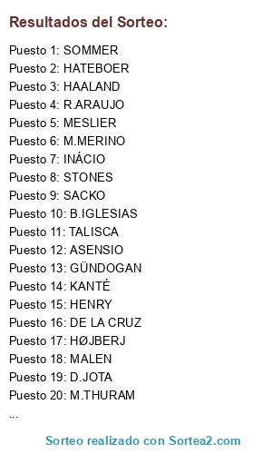 Lista de participantes: SOMMER, MESLIER, HATEBOER, INÁCIO, R.ARAUJO, STONES, SACKO, HENRY, GNABRY, HØJBERJ , GÜNDOGAN , KANTÉ , M.MERINO, DE LA CRUZ, GRAY, ASENSIO, D.JOTA, HAALAND, B.IGLESIAS, M.THURAM, MALEN, TALISCA.
