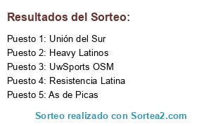 Lista de participantes: As de Picas, Resistencia Latina, UwSports OSM, Unión del Sur, Heavy Latinos.