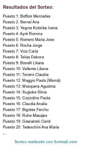 Lista de participantes: Vega Jorge, Costilla Guido, Garcia Castrillon Miguela(2 participaciones), Garzon Laura, Gel Valeria, Scolarici Paula, Gurtchenco Maria Laura, Beltramini Agostina, Tinghitella Estefania, Boano Victoria, Falconi Maria Dalva(2 participaciones), Lombardi Florencia(2 participaciones), Gauna Jimena, Rey Mendez Cecilia, Pereyra Natalia, Cirio Maria Eugenia, Lewysohn Irene, Bigotes Ferchu, Lopez Cottet MariaSoledad, Riveros Lucia, Rocha Jorge, Mendez Cesar, Pareto Carola, Rubino Alejandra, Maggio Paula (Mamá), Castillo Tomas, Mondol Ballestero Maria B, Olocco Angeles(3 participaciones), Diaz Lucila, Dieguez Georgina, Lopez Nova Lucila(2 participaciones), Fiumara Meza Ezequiel(3 participaciones), Tarris Stephanie, Tijero Agustina, Telias Debora(4 participaciones), Grego Sandra, Bartolomeu Susana(2 participaciones), Sugioka Silvia, Ortega Laura, Renza Camila, Tedeschini Fernanda, Molina Angeles, Colasanto Guillermina(2 participaciones), Balverde Romina, Di Meco Soledad, Fossati Florencia, Ayré Romina, Bomczuk Maria, Gonzalez Fernanda, Paroda Maria, Andino Cintia, Gonzalez Mabel Liliana, Martin Alejandra, Maurizio Estefania, Diaz Cortez Micaela, Zeballos Leandro, Pinchiroli Laura Noelia, Bosch Adriana, Punsola Silvana(2 participaciones), Sanchez Rosario, Abdala Mariano, Buffoni Mercedes(2 participaciones), Mercado Sabrina, Corrales Debora(2 participaciones), Monasterio Andrea, Ponte Marta, Diaz Cortez Ximena, Poveda Anita, Frick Alejandra, Napoleone Cecilia, Artigas Martin, Pazzaglini Cecilia, Vico Carla, Casco Florencia, Yegros Kubicka Ivana(2 participaciones), Lozano Pia, Bonelli Liliana, Altamirano Cintia, Bisignani Ana Eulogia, Fraysse Cintia, Arregui Nuñez Giuliana(2 participaciones), Piccinali Romina, Demko Veronica, Valiente Liliana, Oliva Valentina, Munk Florencia, Alfaro Magali, Vallejos Noelia, Gonzalez Carolina, Albornoz Andrea, Finkel Romina, Pianezza Ana Clara, Dass Correa Belen, Bressan Camps Gabriela, Icardo Clara, Ludueña Mariana, Escurra Nancy, Costas Analia, Santini Carolina, Paez Gabriela(2 participaciones), Perez Mariana, Franco Valeria, Gawianski Carol, Acosta Belen, Diaz Viviana, Mosquera Agustina, Malchiodi Milena, Mottesi Maria Celeste, Castro Angeles, Sinde Karina, Rocamora Mariana(2 participaciones), Gatti Natalia, Torrero Claudia(6 participaciones), Biscardi Claudia, Ramos Nicolas, Cabrera Muriel, Bernal Ana, Moryl Vanesa, Ruhe Masajes, Alvarez Federico, Suarez Magali, Kuljis Dalma, @melishae_89, Poliserpi Belen, Villanueva Matias, Guiqueaux Viviana, Corral Beatriz(2 participaciones), Claudia Analia(2 participaciones), Margo Laura, Tedeschini Florencia, Maidana Vanesa, ML Isabel, Luraschi Maria Marta, Barone Maria Florencia, Tedeschini Gustavo, Cozzolino Paola, Pages Gabriela, Pazzaglini Carina(2 participaciones), Romero Maria Jose, Tedeschini Ana Maria(2 participaciones), Massud Jimena.