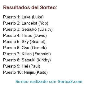 Lista de participantes: Kilian (Franniel), Hei (Paul), Ninjin.(Kaito), Setsuko (Luis :v), Lancelot (Yop), Sky (Scarlet), Satsuki (Kirkby), Gyu (Osmek), Luke (Luke), Hisao (David).