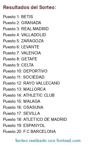 Lista de participantes: ATHLETIC CLUB, ATLETICO DE MADRID, OSASUNA, CELTA, F.C BARCELONA, GETAFE, GRANADA, LEVANTE, MALAGA, VALLADOLID, DEPORTIVO, ESPANYOL, MALLORCA, RAYO VALLECANO, BETIS, REAL MADRID, SOCIEDAD, ZARAGOZA, SEVILLA, VALENCIA.