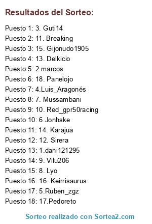 Lista de participantes: 1.dani121295, 2.marcos, 3. Guti14, 4.Luis_Aragonés, 5.Ruben_zgz, 6.Jonhske, 7. Mussambani, 8. Lyo, 9. Vilu206, 10. Red_gpr50racing, 11. Breaking, 12. Sirera, 13. Delkicio, 14. Karajua, 15. Gijonudo1905, 16. Keirrisaurus, 17.Pedoreto, 18. Panelojo.