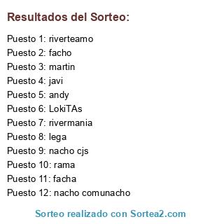 Lista de participantes: facha, rivermania, facho, andy, nacho comunacho, martin, rama, lega, riverteamo, nacho cjs, javi, LokiTAs.