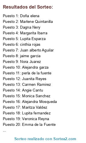 Lista de participantes: Monica Sanchez, Angie Cantu, margarita martinez, norma garcia, jaime garcia, perla de la fuente, juany padilla, cinthia rojas, Doña elena, Emma de la Fuente, Alejandra garza, Juan alberto Aguilar, Lupita fernandez, Dagna Nery, Juany Garcia, Margarita Ibarra, Denise Mendez, Alejandra Mosqueda, Nora Juarez, Elizabeth Melendez, Maritza Valdez, Veronica Reyna, Lizbeth Rodriguez, Gaby Ochoa, Lupita Esparza, Carmen Ramirez, Dora Martinez, Marlene Quintanilla, Juanita Reyes, Elida Quintanilla, Diana Hernandez, Jakelin Quintanilla, Victoria Reyna.