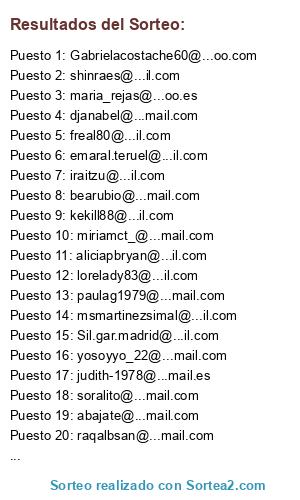 Lista de participantes: @mireiasl, @elvestidordebego, @uncuentollamadodaniella, @saknata, @freal80, @ayaramy, @arantxa.galvez88, @gemmadoblas, @Macamepo, @logofer85, @sandralg58, @ralentorn, @avila.1979, @mary69_2004, @rordovas1, @taniamunozsanchez, @silvia_png, @marta_7menendez, @elisabetparera, @megalkore83, @kekaycarlos, @kekill88, @emaral.teruel, @a.sevimarti, @lauraferretl, @sandala_2, @Gabrielacostache60, @esthernavascues, @lmeloperez, @maria_rejas, @montse.llonch, @salonita, @bellatrix38, @rubisangue, @evaarrazola, @cpmino80, @iraitzu, @majodiaz, @raqalbsan, @djanabel, @2015supermama, @vanessaloex, @nuria.cadavid, @cristinagutierrezjuanes, @alba.sentis, @sodelca, @Beatriz-g, @morenodeviguri, @yosoyyo_22, @suinti, @anagonvet, @andreea.daunis, @raquelg1979, @lorelady83, @felisa628, @osoriolida, @chusi0_20, @anarivera120, @Sil.gar.madrid, @merche.munoz, @iralsur, @soralito, @shinraes, @mariafernu29, @maribcn22, @evacus, @criscaloutlet, @olgaxgu, @fabianyangela, @ma_josedelmonte, @anusky141182, @anagrueda81, @paulag1979, @abajate, @noemarpas, @msmartinezsimal, @maripazguijarro, @bearubio, @judith-1978, @aliciapbryan, @teresaripalda, @miriamct_.