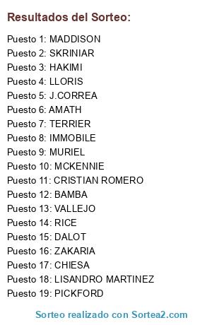 Lista de participantes: LLORIS, PICKFORD, DALOT, SKRINIAR, CRISTIAN ROMERO, LISANDRO MARTINEZ, VALLEJO, HAKIMI, ZAKARIA, RICE, MCKENNIE, MADDISON, BAMBA, AMATH, IMMOBILE, J.CORREA, MURIEL, TERRIER, CHIESA.