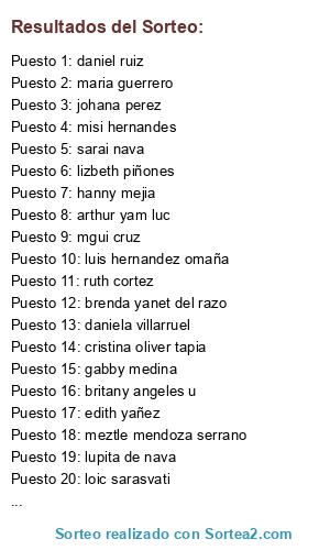 Lista de participantes: alejandro reyes, alexa martinez guerra, angelik sanchez, ani aguirre, anita ocb, anita yitzel cano, antho soto, AQ anirak, ara celi, arg mene, arthur yam luc, azucena anahi casillas oliver, beriel morales, b-kas oliver, bren jima, brenda yanet del razo, britany angeles u, carlos trindade, carmen gomez, carolina diaz, ccynthiia sslideryn, cesar garcia, corayma guzman, cosis bonis, cristina oliver tapia, daliiz guerra de morales, dalila naranjo, daniel ruiz, daniela villarruel, diana santillan, diana soto vega, dul corte, edith yañez, elena juarez, eli ojeda, elian ps, fer olguin, fher zeron, gabby medina, gabii paz gro, gabriela morales, gida olvera barrera, gis paredes, glo vargas, guadalupe hernandez arellano, gzl iveth, hanny mejia, isa cruz, isabel gomez, itzel mb, jeovanny padilla islas, jhocelyn reyes, johana perez, kareen rangeel, karina vega, karla guzman, karla ortega, karla rios, karly kiss, leslie yadira politron, liiz alfaro, lilyana gutierrez, linda hg, lis gonzales, lisseth molina amezquita, lizbeth piñones, loic sarasvati, lucy mendez dominguez, luis hernandez omaña, luis paredes, lupita de nava, ma krmn santiago, maarla trejo, mabell beltran, magda cruz, magu nugu, margarita montalvo, mari luna, maria guerrero, marilu salcedo, mary martinez, mayramychell hernandez, mely orduño, meztle mendoza serrano, mgui cruz, miguel angel romero oviedo, miraldey rio, miriam colorado vigueras, misi hernandes, monica hernandez, mony jimenez, nacho hernandez, nany rivero, nidha arteaga, pao zh, paola val, paulina ibarra, pilar saenz, princess nefesh, rebe flores, rebeca leon, rene peña neri, rey m hernandez, ruth cortez, samuel josadac hernandez garnica, sandy martinez, sarai nava, socram orevir, tuzo cortes, vero cornejo, vero paredes, viviana monserrat, ximena acosta, yadira peña avila, yanny vera, yare saldivar de hernandez, yaret arm, yazzmiinn licona.