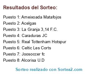Lista de participantes: Caraduras JC, La Granja 3,14 F.C., Celtic Les Corts, Ameixoada Matafojos, Alcorisa U.D, Joosoccer fc, Real Tottenham Hotspur, Acelgas.