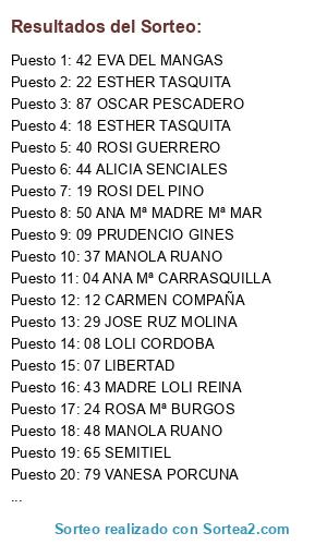 Lista de participantes: 02 LOLI OXIDO, 04 ANA Mª CARRASQUILLA (2 participaciones), 05 JOSE MANUEL RUIZ, 06 ANA HERMANA OLGA, 07 LIBERTAD, 08 LOLI CORDOBA, 09 PRUDENCIO GINES, 11 MARINA HERMANA OLGA, 12 CARMEN COMPAÑA (2 participaciones), 13 MANOLO CAÑETE, 14 ANA Mª CARRASQUILLA, 15 MANOLO CAÑETE MOSCOSO, 16 CARMEN Mª GUERRERO, 17 OLGA HERMANA MARINA, 18 ESTHER TASQUITA (3 participaciones), 19 ROSI DEL PINO (2 participaciones), 22 ESTHER TASQUITA (3 participaciones), 23 TERE MARI ALCOBET, 24 ROSA Mª BURGOS, 25 ESTHER TASQUITA, 28 SUSANA MAMA SUSANA, 29 JOSE RUZ MOLINA, 35 DOLORSITAS PRIMA GEMA, 37 MANOLA RUANO, 40 ROSI GUERRERO, 42 EVA DEL MANGAS, 43 MADRE LOLI REINA, 44 ALICIA SENCIALES, 48 MANOLA RUANO, 50 ANA Mª MADRE Mª MAR (2 participaciones), 53 ANA Mª MADRE Mª MAR, 56 CARMEN MARTOS, 57 CARMEN Mª GUERRERO, 61 CONCHI AMIGA ANA Mª, 64 TRINI, 65 SEMITIEL, 69 ROSI DEL PINO, 74 CAROLINA, 76 BELEN GUERRERO, 79 VANESA PORCUNA, 85 TERE PUB CHIRRO, 87 OSCAR PESCADERO, 88 CARMEN COMPAÑA.