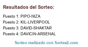 Lista de participantes: KIL-LIVERPOOL, DAVID-SHAKTAR, DAVICIN-ARSENAL, PIPO-NIZA.
