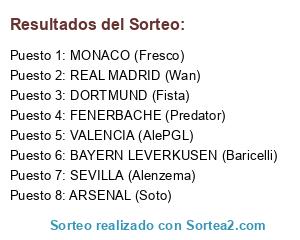 Lista de participantes: RB BRAGANTINO (Baricelli), KRASNODAR (Estupeyonk), ARSENAL (Peperecre), VALENCIA (AlePGL), O. MARSELLA (Soto), SCHALKE 04 (Marlito), TOTTENHAM (Xaviloko), GIRONA (Toni13).