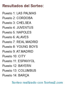 Lista de participantes: AT.MADRID, BAYERN, YOUNG BOYS, CHELSEA, COLUMBUS, CORDOBA, ALAVES, BARÇA, JUVENTUS, CITY, NAPOLES, ESPANYOL, REAL MADRID, LAS PALMAS.
