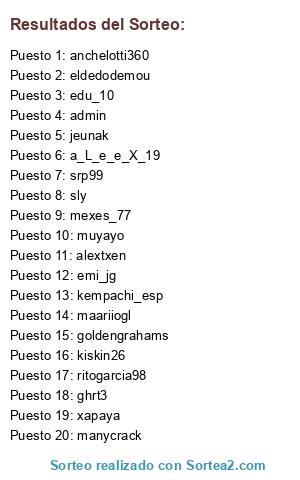Lista de participantes: admin, muyayo, a_L_e_e_X_19, srp99, alextxen, emi_jg, jeunak, maariiogl, manycrack, anchelotti360, sly, eldedodemou, goldengrahams, edu_10, ghrt3, xapaya, kempachi_esp, ritogarcia98, mexes_77, kiskin26.