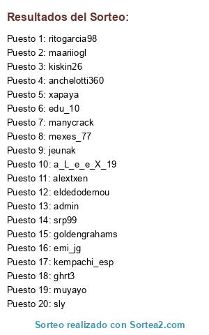 Lista de participantes: admin, muyayo, a_L_e_e_X_19, srp99, alextxen, emi_jg, jeunak, maariiogl, manycrack, anchelotti360, sly, eldedodemou, goldengrahams, edu_10, ghrt3, xapaya, kempachi_esp, ritogarcia98, mexes_77, kiskin26.