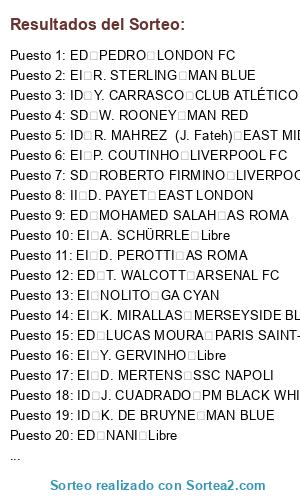 Lista de participantes: ID K. DE BRUYNE MAN BLUE, EI Y. GERVINHO Libre, EI DOUGLAS COSTA Libre, II D. PAYET EAST LONDON, EI N. GAITÁN SL BENFICA, ED JOSÉ CALLEJÓN SSC NAPOLI, ED H. MKHITARYAN BV BORUSSIA 09 DORTMUND, EI D. MERTENS SSC NAPOLI, ED MOHAMED SALAH AS ROMA, ID K. BELLARABI TSV BAYER 04 LEVERKUSEN, ID A. CANDREVA SS LAZIO, EI NOLITO GA CYAN, ID R. MAHREZ (J. Fateh) EAST MIDLANDS, SD ROBERTO FIRMINO LIVERPOOL FC, EI L. INSIGNE SSC NAPOLI, ID Y. CARRASCO CLUB ATLÉTICO DE MADRID, EI K. MIRALLAS MERSEYSIDE BLUE, ED NANI Libre, ED PEDRO LONDON FC, EI D. PEROTTI AS ROMA, ID J. CUADRADO PM BLACK WHITE, EI P. COUTINHO LIVERPOOL FC, ED LUCAS MOURA PARIS SAINT-GERMAIN FC, SD W. ROONEY MAN RED, SD P. DYBALA PM BLACK WHITE, EI I. PERIŠIĆ INTERNAZIONALE, EI A. SCHÜRRLE Libre, ID L. SANÉ FC SCHALKE 04, EI R. STERLING MAN BLUE, ED T. WALCOTT ARSENAL FC.