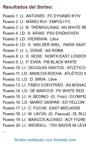 Lista de participantes: LD MARCOS ROCHA ATLÉTICO MINEIRO, LI DOUGLAS SANTOS ATLÉTICO MINEIRO, LI B. TRÉMOULINAS AN WHITE RED, LI FÁBIO COENTRÃO AS MONACO FC, LI M. LAYÚN (G. Pascual) DL BLUE WHITE, LD DE MARCOS PV WHITE RED, LD MARIO GASPAR ED YELLOW, LI J. HECTOR Libre, LI A. CRESSWELL EAST LONDON, LI MÁRIO RUI EMPOLI FC, LI F. GHOULAM (H. Amin Ud Din) SSC NAPOLI, LD S. ARIAS PSV EINDHOVEN, LI L. DIGNE AS ROMA, LD VIEIRINHA Libre, LI P. EVRA PM BLACK WHITE, LD D. SRNA Libre, LI G. CLICHY MAN BLUE, LD C. JALLET OLYMPIQUE LYONNAIS, LD M. PEREIRA DL BLUE WHITE, LI A. KOLAROV MAN BLUE, LI ANTUNES FC DYNAMO KYIV, LI JOSÉ GAYÁ ED WHITE ORANGE, LI H. BEDIMO (G. Finzi) OLYMPIQUE LYONNAIS, LI WENDELL TSV BAYER 04 LEVERKUSEN, LI M. SCHMELZER BV BORUSSIA 09 DORTMUND, LI MARCOS ALONSO ACF FIORENTINA, LD Š. VRSALJKO SANSAGIULO, LI C. FUCHS EAST MIDLANDS, LD G. VAN DER WIEL PARIS SAINT-GERMAIN FC, LI D. ROSE NORTH EAST LONDON.