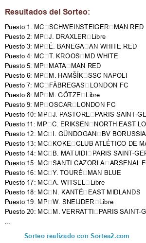 Lista de participantes: MC T. KROOS MD WHITE, MC FÀBREGAS LONDON FC, MC L. MODRIĆ MD WHITE, MC M. VERRATTI PARIS SAINT-GERMAIN FC, MC SANTI CAZORLA ARSENAL FC, MC C. MARCHISIO PM BLACK WHITE, MC B. MATUIDI PARIS SAINT-GERMAIN FC, MC I. RAKITIĆ FC BARCELONA, MC M. PJANIĆ (S. Krilic) PM BLACK WHITE, MC KOKE CLUB ATLÉTICO DE MADRID, MC THIAGO Libre, MC I. GÜNDOGAN BV BORUSSIA 09 DORTMUND, MC SCHWEINSTEIGER MAN RED, MC Y. TOURÉ MAN BLUE, MC A. WITSEL Libre, MC R. NAINGGOLAN AS ROMA, MC N. KANTÉ EAST MIDLANDS, MP M. ÖZIL ARSENAL FC, MP M. HAMŠÍK SSC NAPOLI, MP J. RODRÍGUEZ MD WHITE, MP W. SNEIJDER Libre, MP É. BANEGA AN WHITE RED, MP MATA MAN RED, MP A. TURAN (M. Gungor) FC BARCELONA, MP S. KAGAWA (D. Yoshioka) BV BORUSSIA 09 DORTMUND, MP OSCAR LONDON FC, MP J. PASTORE PARIS SAINT-GERMAIN FC, MP C. ERIKSEN NORTH EAST LONDON, MP M. GÖTZE Libre, MP J. DRAXLER Libre.