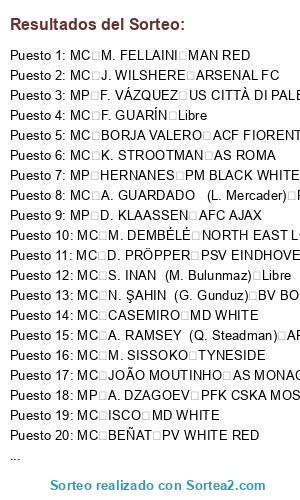 Lista de participantes: MC JOÃO MOUTINHO AS MONACO FC, MC M. DEMBÉLÉ NORTH EAST LONDON, MC BORJA VALERO ACF FIORENTINA, MC A. GUARDADO (L. Mercader) PSV EINDHOVEN, MC K. STROOTMAN AS ROMA, MC J. WILSHERE ARSENAL FC, MC G. XHAKA Libre, MC ISCO MD WHITE, MC A. RAMSEY (Q. Steadman) ARSENAL FC, MC GABI CLUB ATLÉTICO DE MADRID, MC RAMIRES JIANGSU SUNING FC, MC S. KHEDIRA PM BLACK WHITE, MC M. SISSOKO TYNESIDE, MP F. VÁZQUEZ US CITTÀ DI PALERMO, MP H. ZIYECH FC TWENTE, II S. NASRI MAN BLUE, MP H. BEN ARFA O.G.C. NICE CÔTE D'AZUR, MP A. DZAGOEV PFK CSKA MOSKVA, MC F. GUARÍN Libre, MC BEÑAT PV WHITE RED, MP HERNANES PM BLACK WHITE, MC D. PRÖPPER PSV EINDHOVEN, MP D. KLAASSEN AFC AJAX, MC N. ŞAHIN (G. Gunduz) BV BORUSSIA 09 DORTMUND, MC S. INAN (M. Bulunmaz) Libre, MC G. KONDOGBIA INTERNAZIONALE, MC CASEMIRO MD WHITE, MC M. FELLAINI MAN RED, MP M. VALBUENA OLYMPIQUE LYONNAIS, MP R. BARKLEY MERSEYSIDE BLUE.