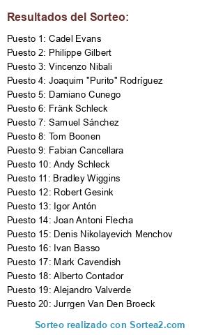 Lista de participantes: Joaquim "Purito" Rodríguez, Alberto Contador, Philippe Gilbert, Cadel Evans, Andy Schleck, Fabian Cancellara, Samuel Sánchez, Mark Cavendish, Fränk Schleck, Damiano Cunego, Bradley Wiggins, Vincenzo Nibali, Denis Nikolayevich Menchov, Ivan Basso, Igor Antón, Tom Boonen, Alejandro Valverde, Jurrgen Van Den Broeck, Robert Gesink, Joan Antoni Flecha.