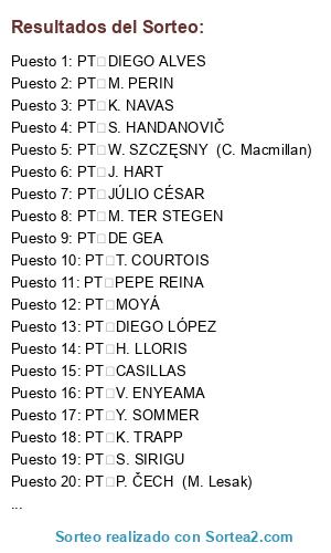 Lista de participantes: PT M. NEUER, PT G. BUFFON, PT DE GEA, PT T. COURTOIS, PT P. ČECH (M. Lesak), PT H. LLORIS, PT S. HANDANOVIČ, PT C. BRAVO, PT K. NAVAS, PT J. OBLAK, PT V. ENYEAMA, PT DIEGO LÓPEZ, PT S. SIRIGU, PT J. HART, PT B. LENO, PT R. FÄHRMANN, PT PEPE REINA, PT JÚLIO CÉSAR, PT DIEGO ALVES, PT S. MANDANDA, PT M. PERIN, PT CASILLAS, PT K. SCHMEICHEL, PT Y. SOMMER, PT ANTHONY LOPES, PT M. TER STEGEN, PT K. TRAPP, PT W. SZCZĘSNY (C. Macmillan), PT A. BEGOVIĆ (J.Masovic), PT MOYÁ.