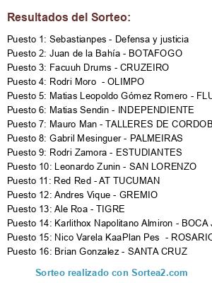 Lista de participantes: Matias Sendin - INDEPENDIENTE, Ale Roa - TIGRE, Red Red - AT TUCUMAN, Rodri Zamora - ESTUDIANTES, Sebastianpes - Defensa y justicia, Rodri Moro - OLIMPO, Facuuh Drums - CRUZEIRO, Brian Gonzalez - SANTA CRUZ, Matias Leopoldo Gómez Romero - FLUMINENSE, Leonardo Zunin - SAN LORENZO, Mauro Man - TALLERES DE CORDOBA, Karlithox Napolitano Almiron - BOCA JR, Andres Vique - GREMIO, Gabril Mesinguer - PALMEIRAS, Juan de la Bahía - BOTAFOGO, Nico Varela KaaPlan Pes - ROSARIO CENTRAL.