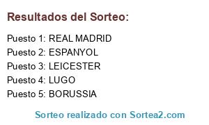 Lista de participantes: ESPANYOL, BORUSSIA, LUGO, LEICESTER, REAL MADRID.