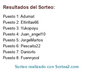 Lista de participantes: Adumat, Pescaito22, Eltirillas66, JorgeMartos, Daniorlo, Fuennyool, Juan_angel10, Yukopoyu.