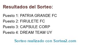 Lista de participantes: PATRIA GRANDE FC, FIRULETE FC, DREAM TEAM UY, CAPSULE CORP.