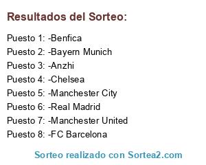 Lista de participantes: -FC Barcelona, -Chelsea, -Manchester City, -Anzhi, -Real Madrid, -Manchester United, -Bayern Munich, -Benfica.