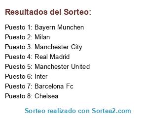 Lista de participantes: Real Madrid, Barcelona Fc, Chelsea, Manchester United, Manchester City, Milan, Inter, Bayern Munchen.