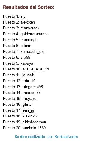 Lista de participantes: admin, muyayo, a_L_e_e_X_19, srp99, alextxen, emi_jg, jeunak, maariiogl, manycrack, anchelotti360, sly, eldedodemou, goldengrahams, edu_10, ghrt3, xapaya, kempachi_esp, ritogarcia98, mexes_77, kiskin26.