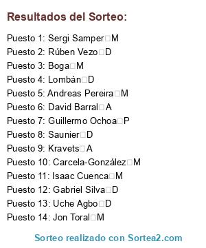 Lista de participantes: Andreas Pereira M, Boga M, Carcela-González M, David Barral A, Gabriel Silva D, Guillermo Ochoa P, Isaac Cuenca M, Jon Toral M, Kravets A, Lombán D, Rúben Vezo D, Saunier D, Sergi Samper M, Uche Agbo D.