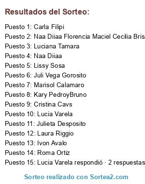Lista de participantes: Roma Ortiz, Juli Vega Gorosito, Lucia Varela respondió · 2 respuestas, Naa Diiaa, Naa Diiaa Florencia Maciel Cecilia Brisa Xoanaa Carla Bal, Ivon Avalo, Marisol Calamaro, Lucia Varela, Laura Riggio, Julieta Desposito, Carla Filipi, Kary PedroyBruno, Cristina Cavs, Luciana Tamara, Lissy Sosa.